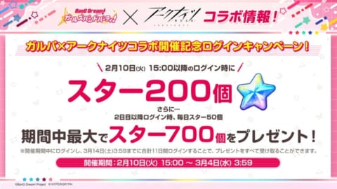 2026年2月10日(火)15時以降にログインすると、初日はスター200個、2日目以降は毎日スター50個をプレゼントします。開催期間中の合計11日間のログインで、最大スター700個を獲得できます。プレゼントの受け取りは2026年3月14日(土)3時59分までです。