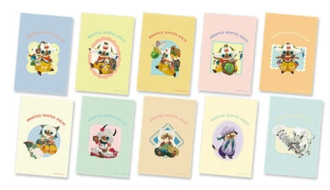 『モンスターハンターワイルズ』に登場するオトモアイルーが、あたたかみのあるやわらかいタッチで描かれたイラストで登場します。「ホープネコシリーズ」や「シュバルカネコシリーズ」、「ラバラネコシリーズ」など、様々な装備姿のオトモアイルーが勢ぞろいします。