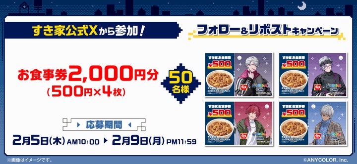 株式会社すき家は、2026年2月5日(木)より、『にじさんじ』の“せめ4”とのコラボキャンペーン「せめ4と一緒にすき家なんじゃない?」を開催します。オリジナルカードや限定グッズ抽選、店内放送など多数の企画が登場します。