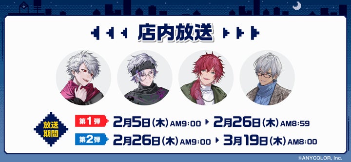 各弾で放送内容は異なります。店内放送は1時間に1回、毎時15分頃に行われる予定です(一部店舗を除く)。フードコート店舗や学食内店舗では放送がありませんのでご注意ください。