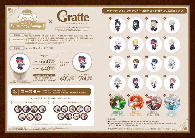 各アイドルの誕生日を記念したバースデードリンクを提供します。カフェ店内およびテイクアウトで利用可能です。なお、2026年2月16日と4月6日は店内メンテナンスのため休業します。