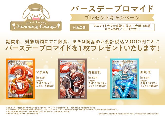 期間中、対象店舗でのご飲食または商品のお会計2,000円(税込)ごとにバースデーブロマイドを1枚プレゼントするキャンペーンを実施します。既に「レインボーシティ編」で配布していた二階堂大和のバースデーブロマイドも、2026年2月17日より配布を再開します(なくなり次第終了)。