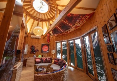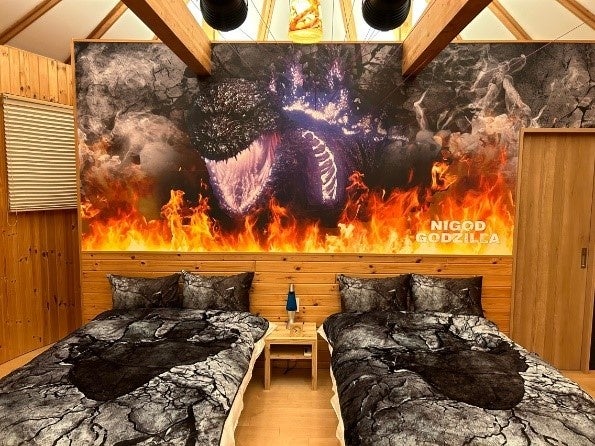 「ニジゲンノモリ」内にあるグランピング施設「グランシャリオ北斗七星135°」では、ゴジラをテーマにしたコラボルームを提供しています。