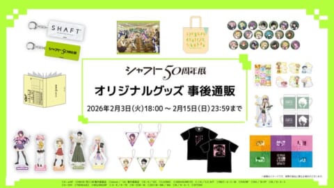 アニメーションスタジオ・シャフト設立50周年を記念した「シャフト50周年展」のオフィシャルグッズが、本日2月3日18時よりアニプレックスオンラインにて事後通販を開始しました。会場で販売された限定アイテムを自宅から購入できます。