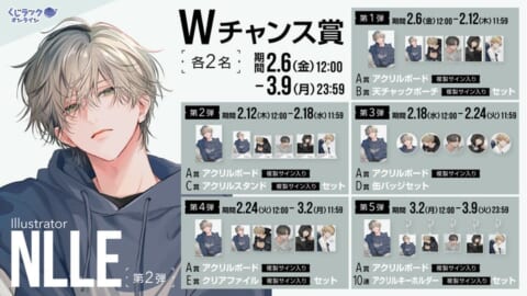 今回のコラボレーションでしか手に入らないNLLE氏のオリジナルグッズを、ぜひこの機会に「くじラックオンライン」で手に入れてください。