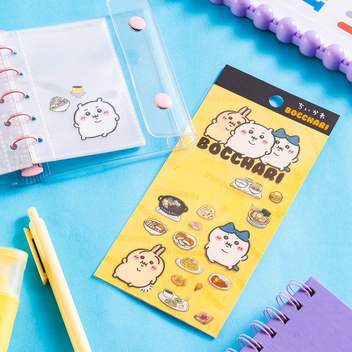 ぼっちゃりとしたちいかわたちと、郎ラーメンやプリン、すき焼きなどの美味しそうな食べ物がセットになったクリアシールです。ちいかわたちの隣に食べ物のシールを貼ることで、食べ物の存在感を一層引き立てます。