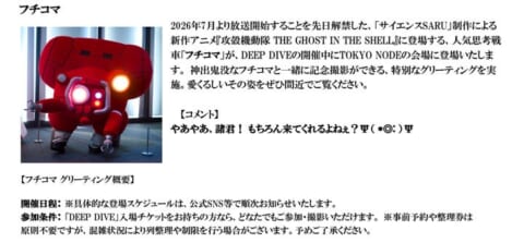 2026年7月より放送開始予定の新作アニメ『攻殻機動隊 THE GHOST IN THE SHELL』に登場するフチコマが会場に駆けつけ、観客とのミートアンドグリートを実施します。
