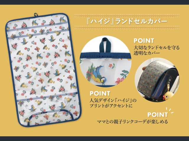 ランドセルに被せる透明なカバーも登場します。ランドセルのかぶせの内側プリントと連動したフェイラーの人気デザイン『ハイジ』が施されており、統一感のあるコーディネートを楽しめます。ランドセルとランドセルカバーは別売りです。