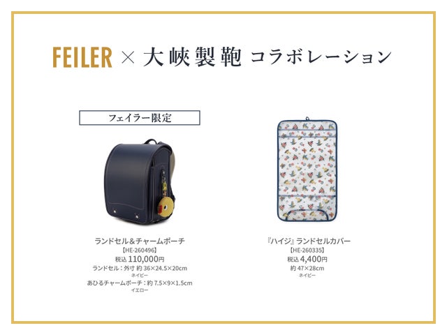 フェイラーは、ランドセルメーカー大峽製鞄との初のコラボレーションランドセルを2026年5月に発売します。限定ネイビーカラーのランドセルと『ハイジ』柄のランドセルカバーが登場し、三越伊勢丹オリジナルカラーも展開されます。