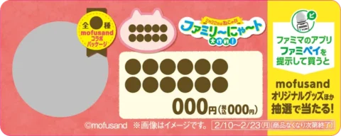 期間中、ファミマのアプリ「ファミペイ」を提示して対象の「mofusand」コラボ商品全13種類を購入するとスタンプが貯まります。貯まったスタンプで、「mofusand 2026コラボ 描き下ろし マルシェバッグ」やファミマポイント222円相当が抽選で合計222名に当たります。