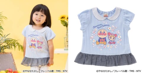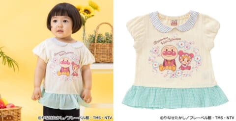 裾のフリルと涼しげな素材が魅力の襟付きトップスです。アンパンマンとあかちゃんまんのお座りポーズをプリントし、パフスリーブやドット柄の丸襟など、可愛い要素が詰まっています。カラーはクリームとサックスブルー、サイズは80~120cmです。
