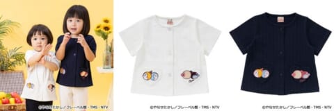 ハート型のポケットにアンパンマンやばいきんまん、ドキンちゃん、コキンちゃんの横顔を刺繍した半袖カーディガンです。ボタンはお花型で、裏にはドット柄のテープを施すなど、細部にまでこだわったデザインです。カラーはオフ白とネイビー、サイズは90~120cmです。