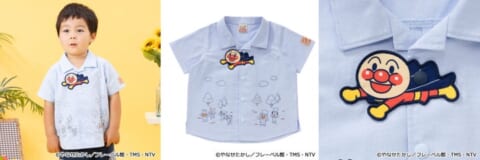一番上のボタンにアンパンマンのアップリケが付いた、可愛らしい半袖シャツです。面ファスナーでボタンを留められ、フロントにはジャムおじさんやバタコさんがアンパンマンを見上げるデザインをプリントしました。カラーはサックスブルー、サイズは90~120cmです。