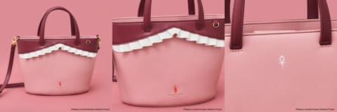バッグ背面には巴マミが身に着けている髪飾りのモチーフをポイントにしました。裏地にはポケットを付け小物収納ができ、フロントの右上にはチャームを付けられる金具を配置しました。