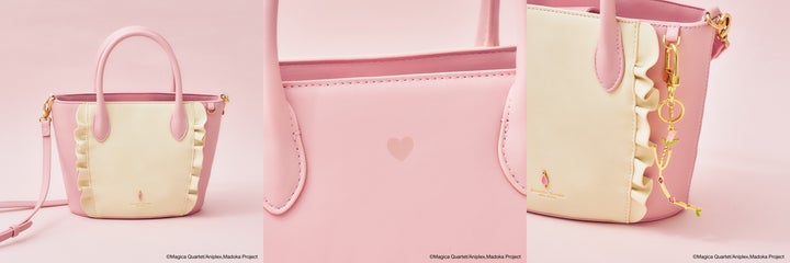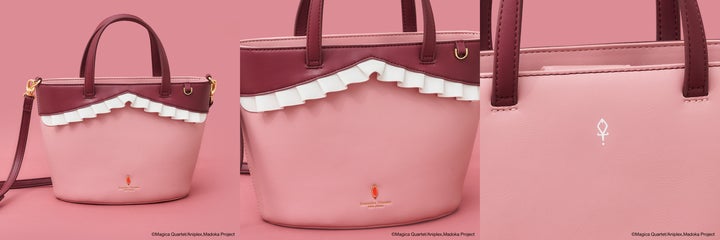 「鹿目まどか」のコレクションは、着用衣装をモチーフにしたフリルやピンクのカラーリングが特徴です。フロント部分には鹿目まどかのソウルジェムをモチーフにした金具をデザインしています。