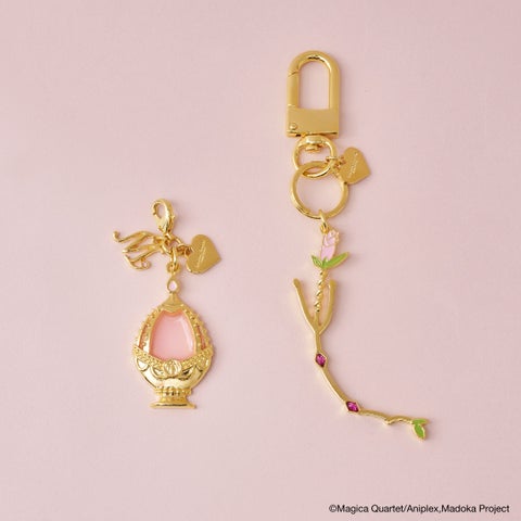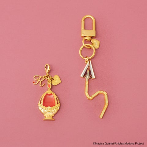 ファスナーチャームはソウルジェムをモチーフとし、鹿目まどかのMのイニシャルをデザインしています。キーリングは作中で使用する弓矢の武器をモチーフにしました。