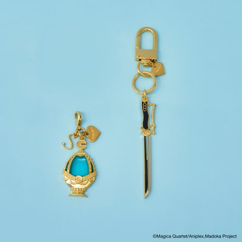 ファスナーチャームはソウルジェムをモチーフとし、美樹さやかのSのイニシャルをデザインしています。キーリングは作中で使用する剣をモチーフにしました。