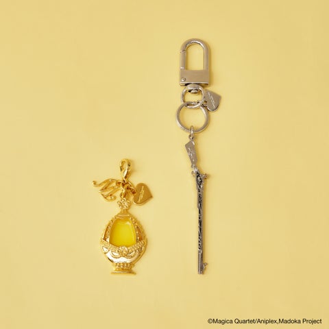 ファスナーチャームはソウルジェムをモチーフとし、巴マミのMのイニシャルをデザインしています。キーリングは作中で使用するマスケット銃をモチーフにしました。