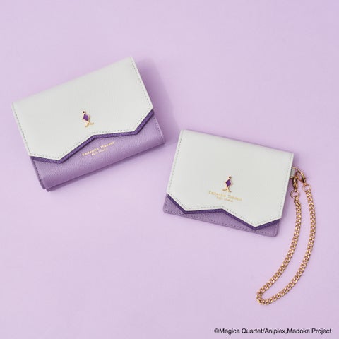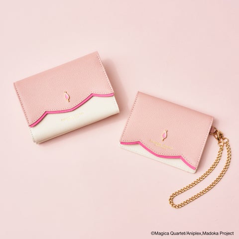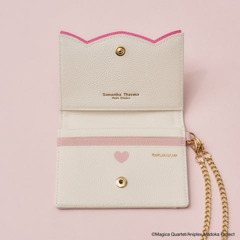 パスケースの内側と折財布の背面には、鹿目まどかの衣装に施されたハートのマークをポイントにしました。折財布のフロントフラップは衣装をモチーフにしたデザインです。