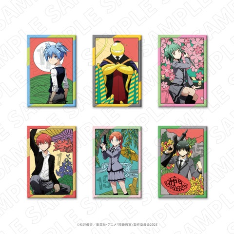 アクリルスタンドと同じく、殺せんせー、赤羽業、潮田渚、茅野カエデ、速水凛香、千葉龍之介の6種類の長方形缶バッジがラインナップ。カバンや服に付けて、お気に入りのキャラクターをアピールできます。