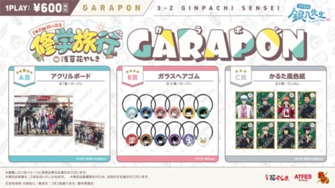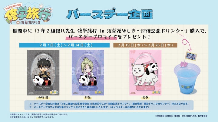 - バースデーブロマイドプレゼント: 期間中に「3年Z組銀八先生 修学旅行 in 浅草花やしき~開催記念ドリンク~」を購入すると「バースデーブロマイド」が1枚プレゼントされます(数量限定)。
