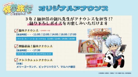 坂田銀八(CV: 杉田智和)による録り下ろし園内アナウンスが楽しめます。