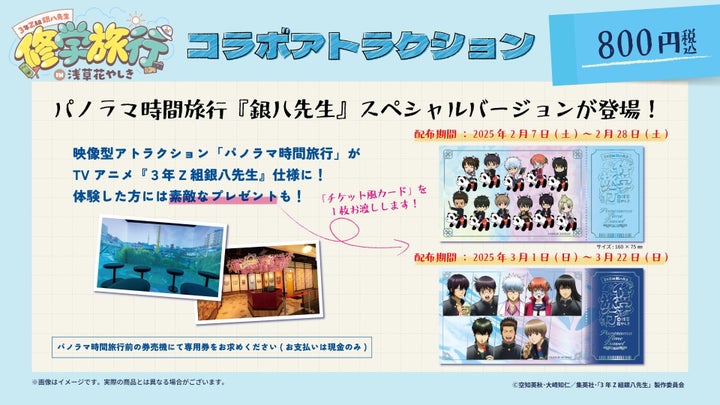 4面マルチ映像を楽しめるアトラクション「パノラマ時間旅行」がTVアニメ『3年Z組銀八先生』仕様のスペシャルバージョンで登場します。これまでの「3年Z組銀八先生」の歴史を振り返る内容です。体験された方には「チケット風カード」(前半 全1種/後半 全1種)が1枚プレゼントされます。