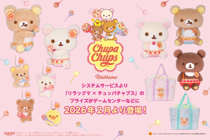 システムサービスは、リラックマとチュッパチャプスのコラボプライズを2026年2月より順次全国のアミューズメント施設に導入します。可愛らしいぬいぐるみやマスコットキーチェーンなどが登場します。