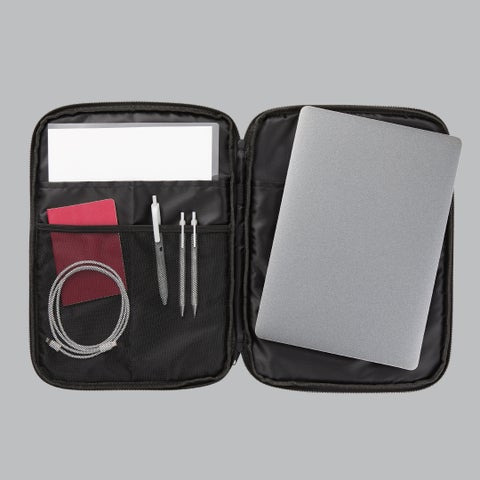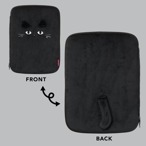 黒ねこA4マルチケースは、A4サイズのクリアファイルに加え、13〜14インチのノートPCを収納可能です。ただし、パソコンのメーカーや形状によっては入らない場合があります。内側は中身が見やすいメッシュ仕様で、書類やPC周辺アイテムを整理できます。どちらのアイテムも、黒ねこの耳としっぽをあしらい、細部までデザインにこだわりました。