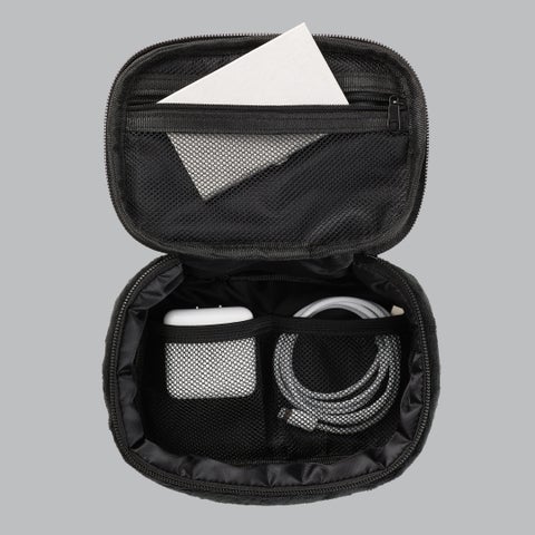 黒ねこマルチポーチは、ふわふわとした肌触りが特長です。マチが約6cmと厚みがあり、収納力に優れています。180度大きく開く設計で、中身をひと目で確認しやすい構造です。チャック付きのメッシュ仕切りを備えており、充電ケーブルなどのガジェット類や文房具、旅行用メイクポーチとしても活用できます。また、サイドにはケーブルを通せるケーブルポートが付いており、モバイルバッテリーを収納したままスマートフォンを充電できるため、外出先でも便利です。