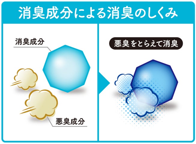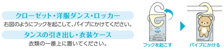 また、消臭成分を配合しているため、収納空間にこもりがちな汗臭、体臭、カビ臭といったニオイを消臭します。既存の防虫剤との併用も可能です。