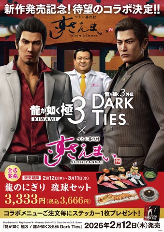 株式会社喜代村は、ゲーム『龍が如く 極3 / 龍が如く3外伝 Dark Ties』とのコラボキャンペーンを2026年2月12日より開催します。限定メニュー「龍のにぎり 琉球セット」の提供やオリジナルステッカーのプレゼント、SNSキャンペーンを実施します。