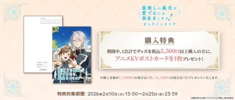 グッズを5,500円(税込)以上購入するごとに、TVアニメのキービジュアルを使用したオリジナルポストカード(全1種)を1枚プレゼントします。累計購入金額に応じて、11,000円(税込)で2枚、16,500円(税込)で3枚と、特典枚数が増加する仕組みです。