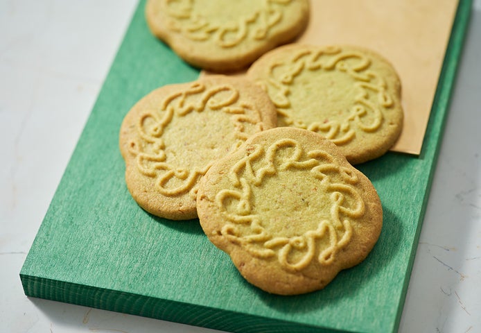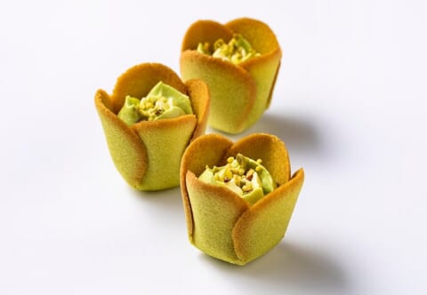 芳醇な香りのピスタチオとバターの生食感ショコラクリームを、フランス産発酵バター香るグリーンの花びらラングドシャクッキーの中に入れました。