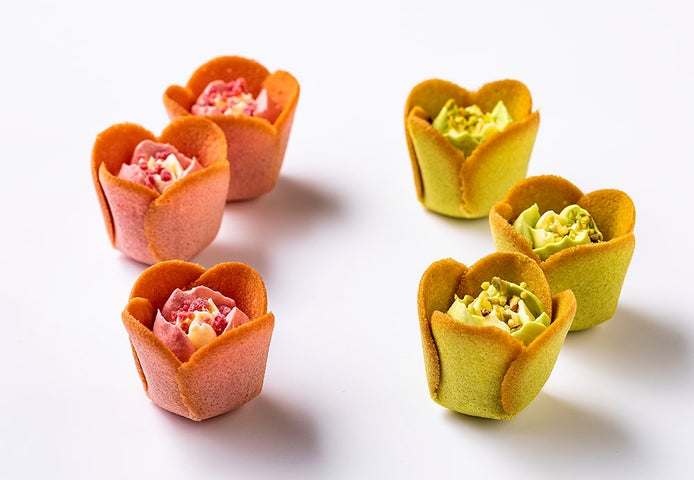 フランス産発酵バターの香り溢れるさくさくのラングドシャクッキーに、生食感ショコラクリームをたっぷり二重にしぼりました。「ストロベリーバター」と「ピスタチオバター」のふたつのチューリップローズの出会いを堪能できます。