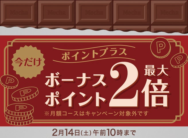 キャンペーン期間中に対象のポイントプラスコースでポイントを購入すると、通常の最大2倍のボーナスポイントを獲得できます。必要なときに必要な分だけポイントを購入できる「ポイントプラス」での実施です。