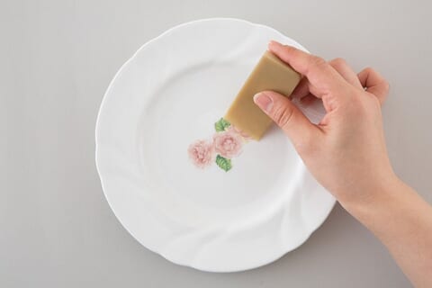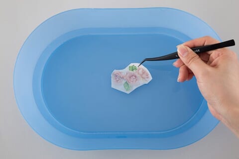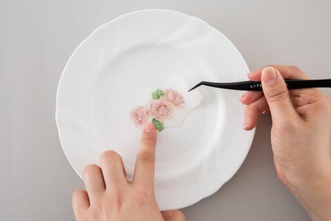 転写紙は、水に浸して台紙から剥がし、白磁に貼り付けます。その後、約800度の電気炉で焼成することで、絵柄がしっかりと定着します。安全基準もクリアしており、安心してオリジナル作品づくりを楽しめます。