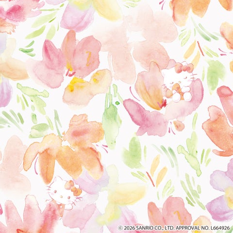 ベビーピンクやコーラルオレンジのお花畑でハローキティがかくれんぼしています。甘く柔らかな暖色がハローキティの可愛さを引き立て、ふんわり包み込むようなムードをまとわせます。