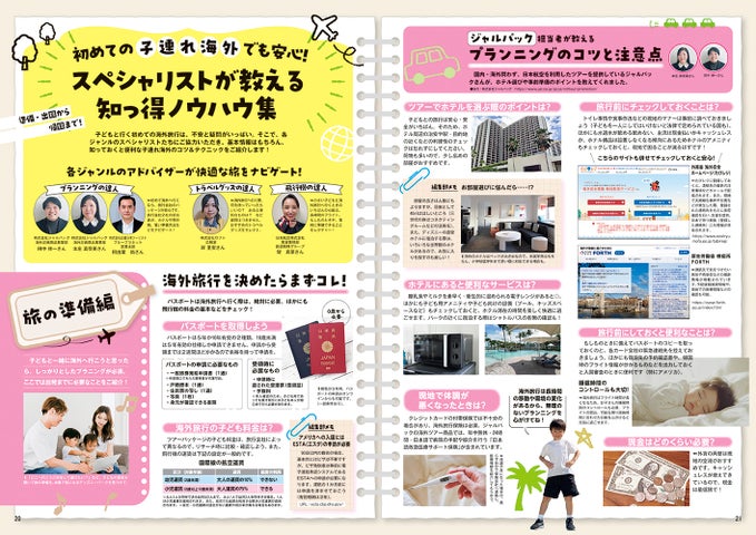 「子どものパスポート申請は?」「長時間のフライト対策は?」「現地で体調が悪くなったら?」など、パパ・ママの不安を解消するための情報が満載です。旅行会社のスペシャリストや、旅慣れた先輩家族のアドバイスを掲載し、プランニングのコツから持ち物リストまで、実用的な情報が充実しています。