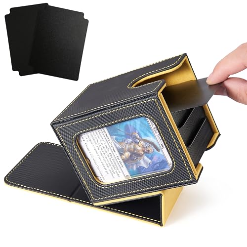 Venssu デッキケース トレカケース カードディスプレイウィンドウ 100枚 二重 三重スリーブ対応 縦入れ 仕切り2つとトップローダー1つ付き 革 (黒内装黄)