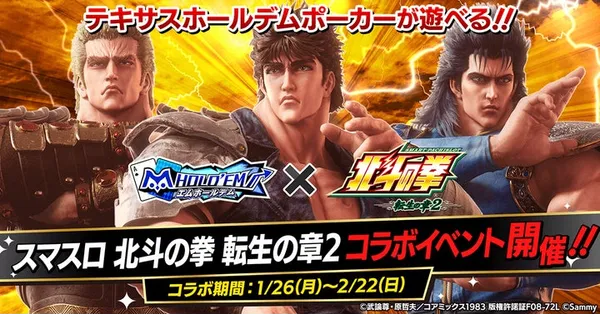 2026年1月18日 15:06「m HOLD’EM(エムホールデム)」が『スマスロ 北斗の拳 転生の章2』とのコラボイベ...