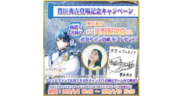 2026年1月5日 17:26スマホRPG「天空のアムネジア」では、声優「矢野妃菜喜」さんの直筆サイン色紙プレ...
