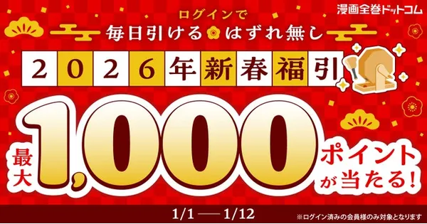 2026年1月3日 14:28漫画全巻ドットコムは、2026年1月1日より「新春福引き」を開催しています。ログイ... -