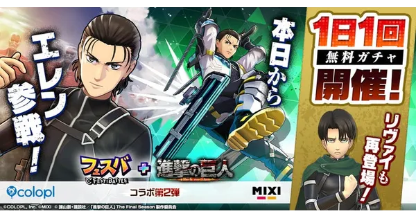 フェスバ+ 進撃の巨人コラボ第2弾!エレン登場&1日1回無料ガチャも!