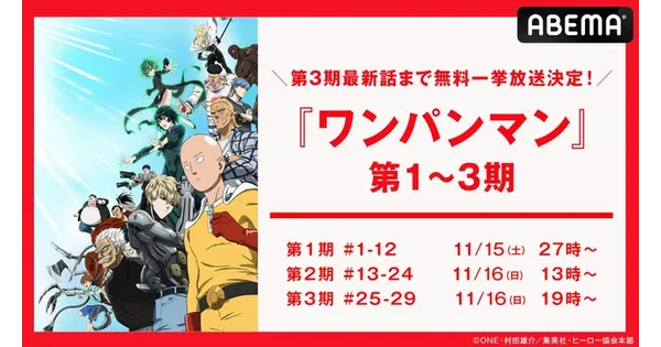 2025年11月13日 20:28新しい未来のテレビ「ABEMA」にて、大人気ヒーローアニメ『ワンパンマン』の第1期... -