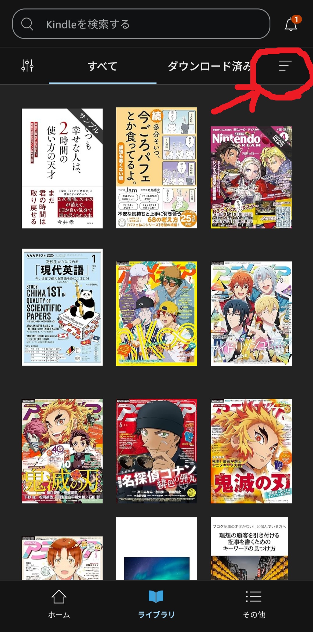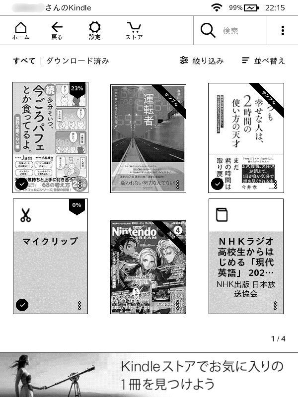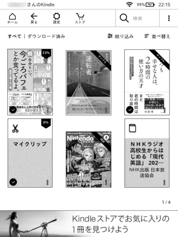Kindleデバイスの「ライブラリ」には、AmazonアカウントにあるKindle本の表紙が一覧で表示されます。