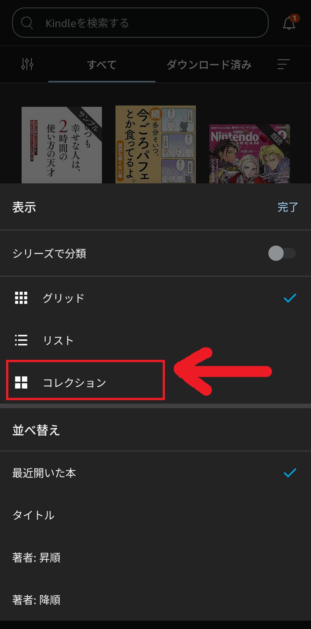 ライブラリ内のKindle本は、既読・未読、Kindle Unlimited対象、コンテンツタイプで絞り込んで検索できます。表示方法をグリッド表示、リスト表示、コレクションのように変更できるほか、タイトルや出版日などの順にも並べ替えが可能です。