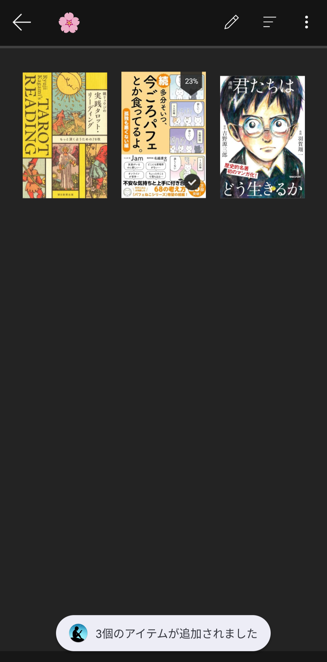 ライブラリには、ダウンロード済みの本だけでなく、Amazonアカウントにある全てのKindle本が表示されます。読みたい本をタップするとダウンロードが開始され、オフラインでも読めるようになります。
