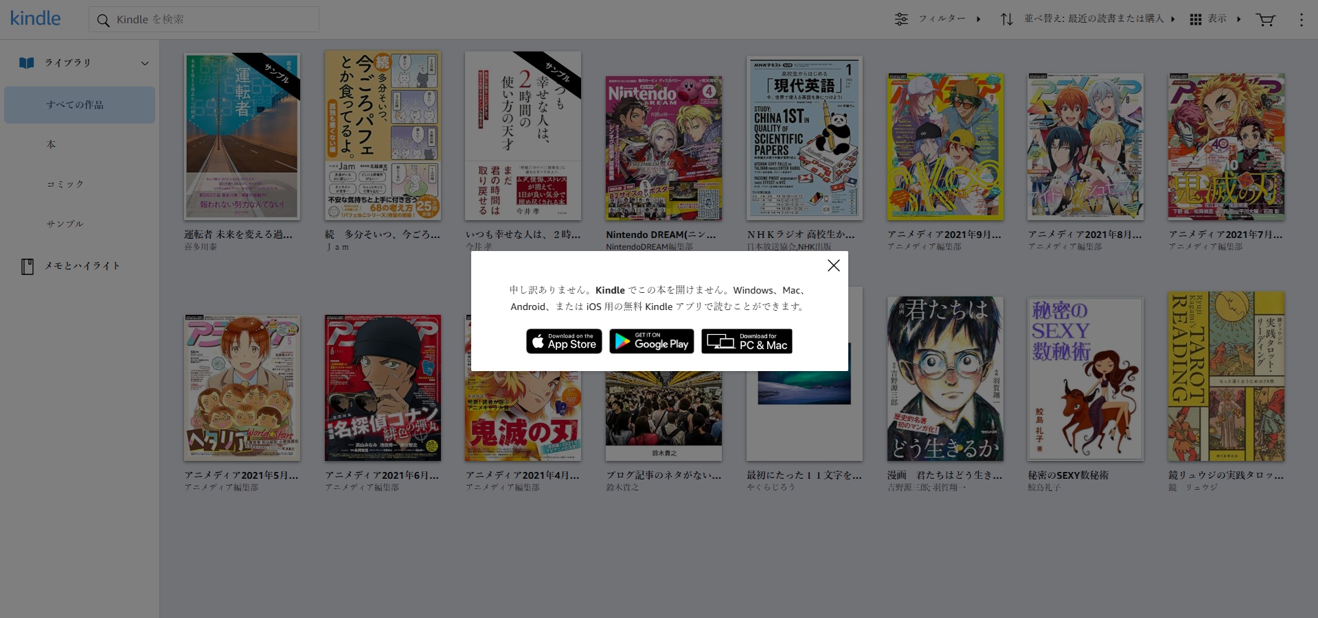 - 対応書籍: 現在、ブラウザから閲覧できるのはマンガ・雑誌・英語の本のみです。日本語の小説をはじめとした一般的な書籍はKindle for PCアプリまたはKindleアプリで読む必要があります。