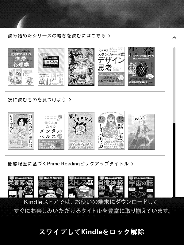 これでKindleデバイスのセットアップは完了し、ホーム画面が表示されます。